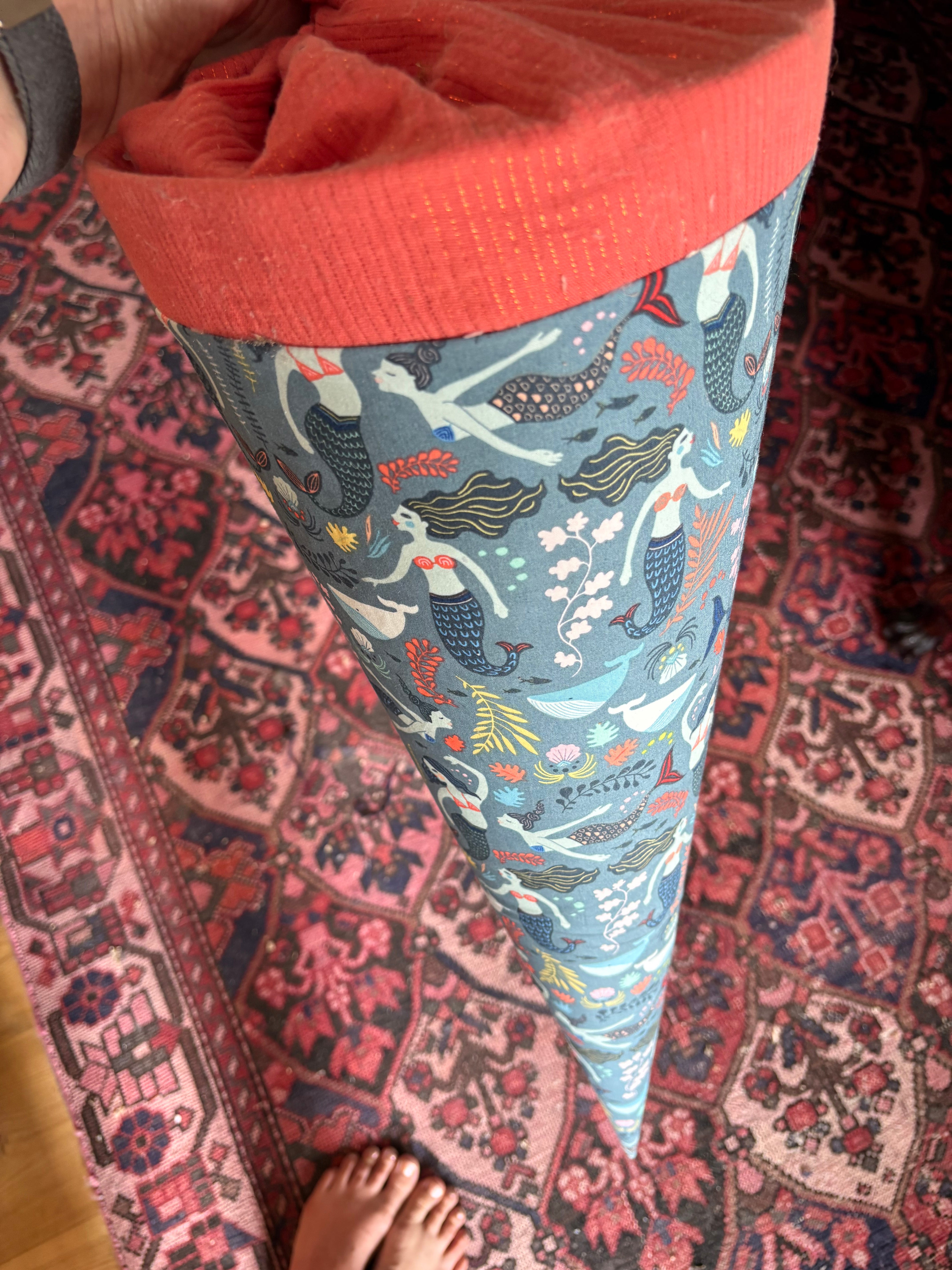 After a few years watching parades of children wielding bright cones of stationery, I got envious. With a birthday at the end of August, however, I knew what to do. When my husband asked me what I’d like as a gift, I requested my own Schultüte. He delivered. I still have the cone he found me, which is covered in mermaid-patterened fabric and came to me topped up with candy-colored erasers, striped pencils and notepads. It remains one of my favorite presents to this day.
